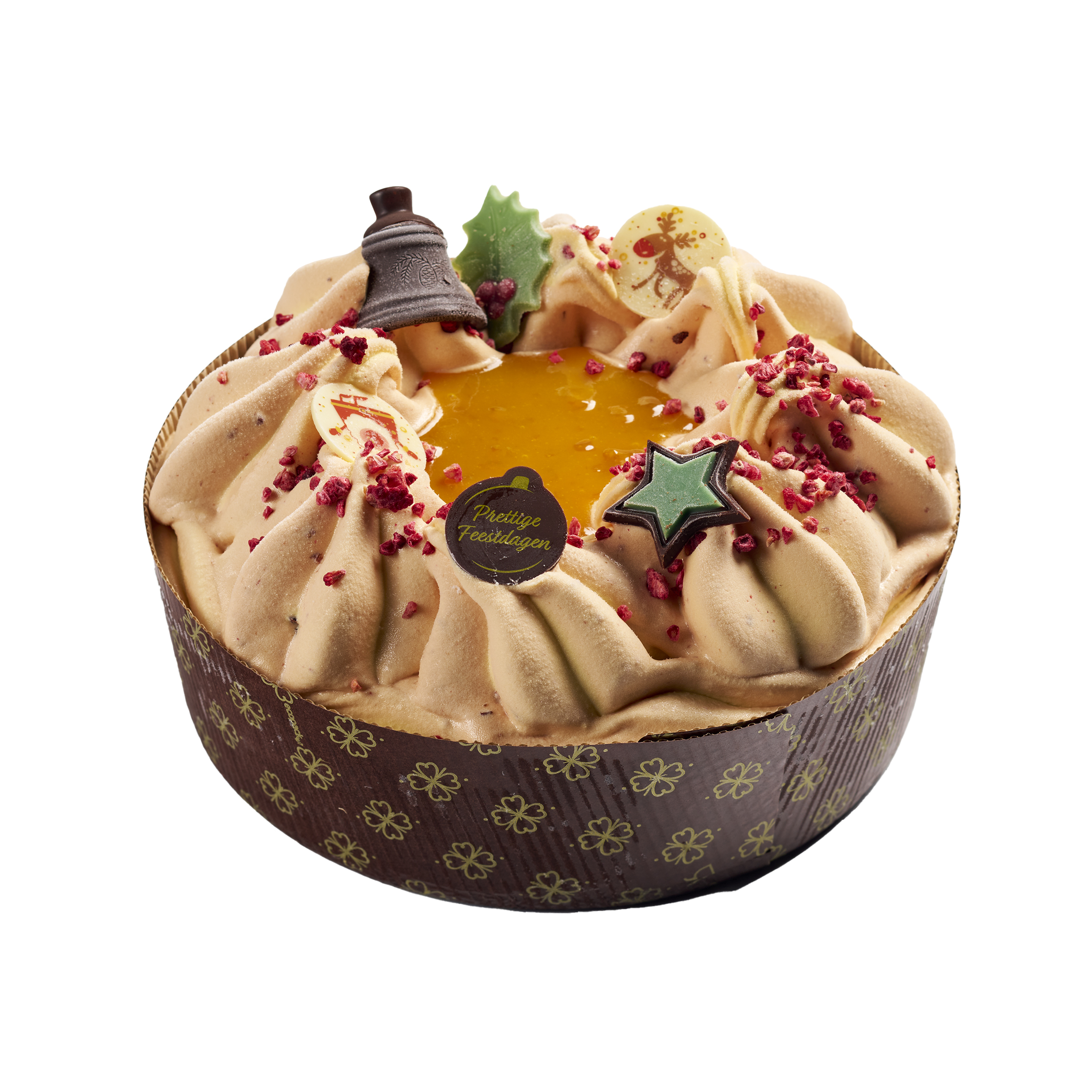 IJstaart van witte chocolade met subtiele tonen van pistache en rijkelijk gevuld met kadayif. Luxe, exotisch en gehuld in een vleugje gouden elegantie. 8 pers.